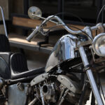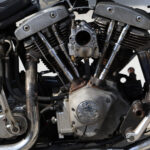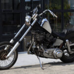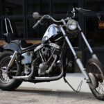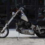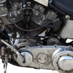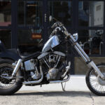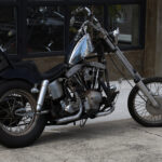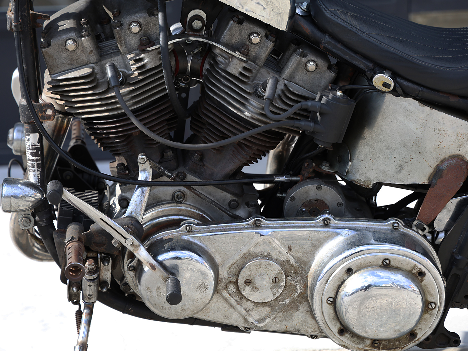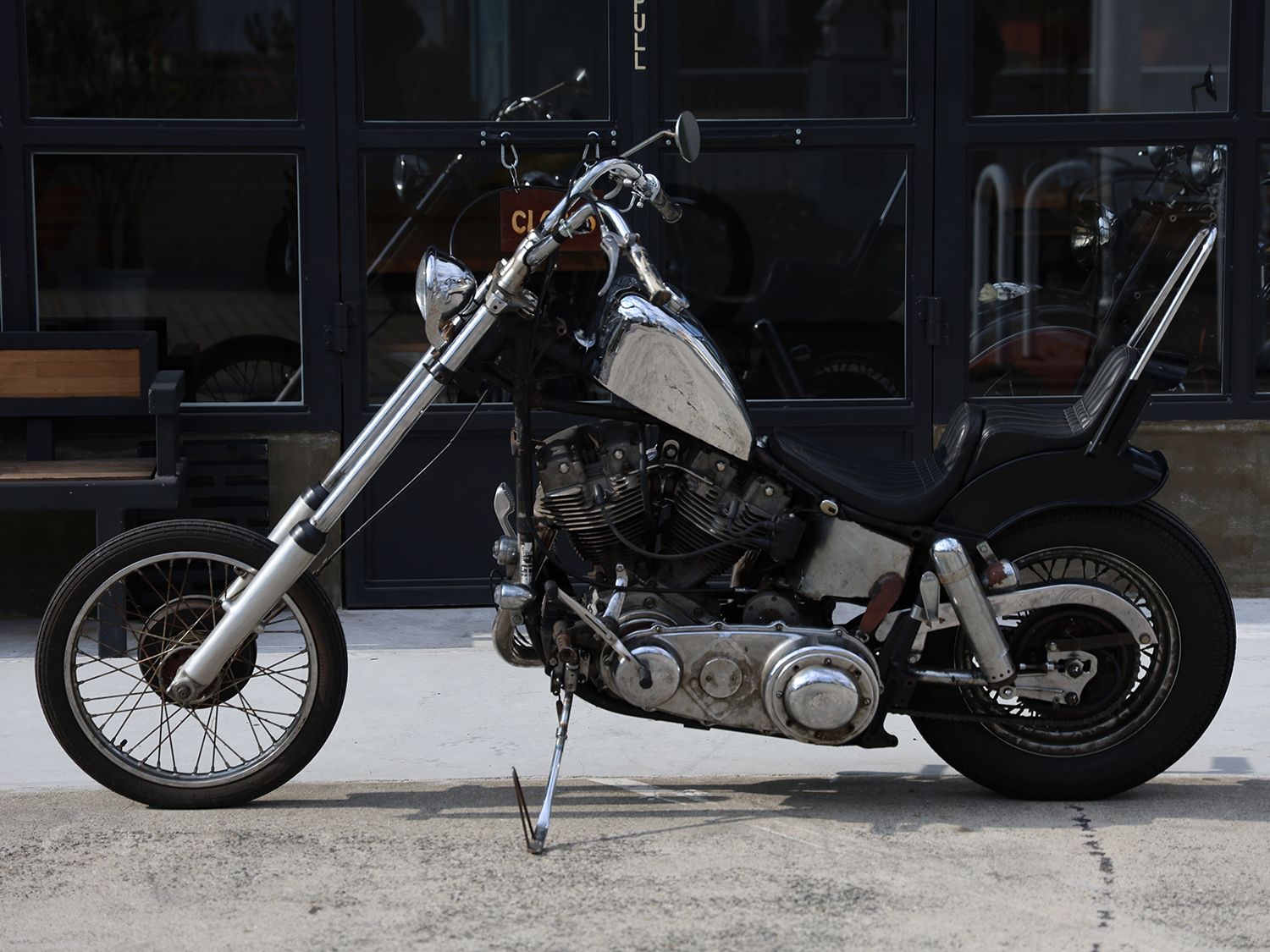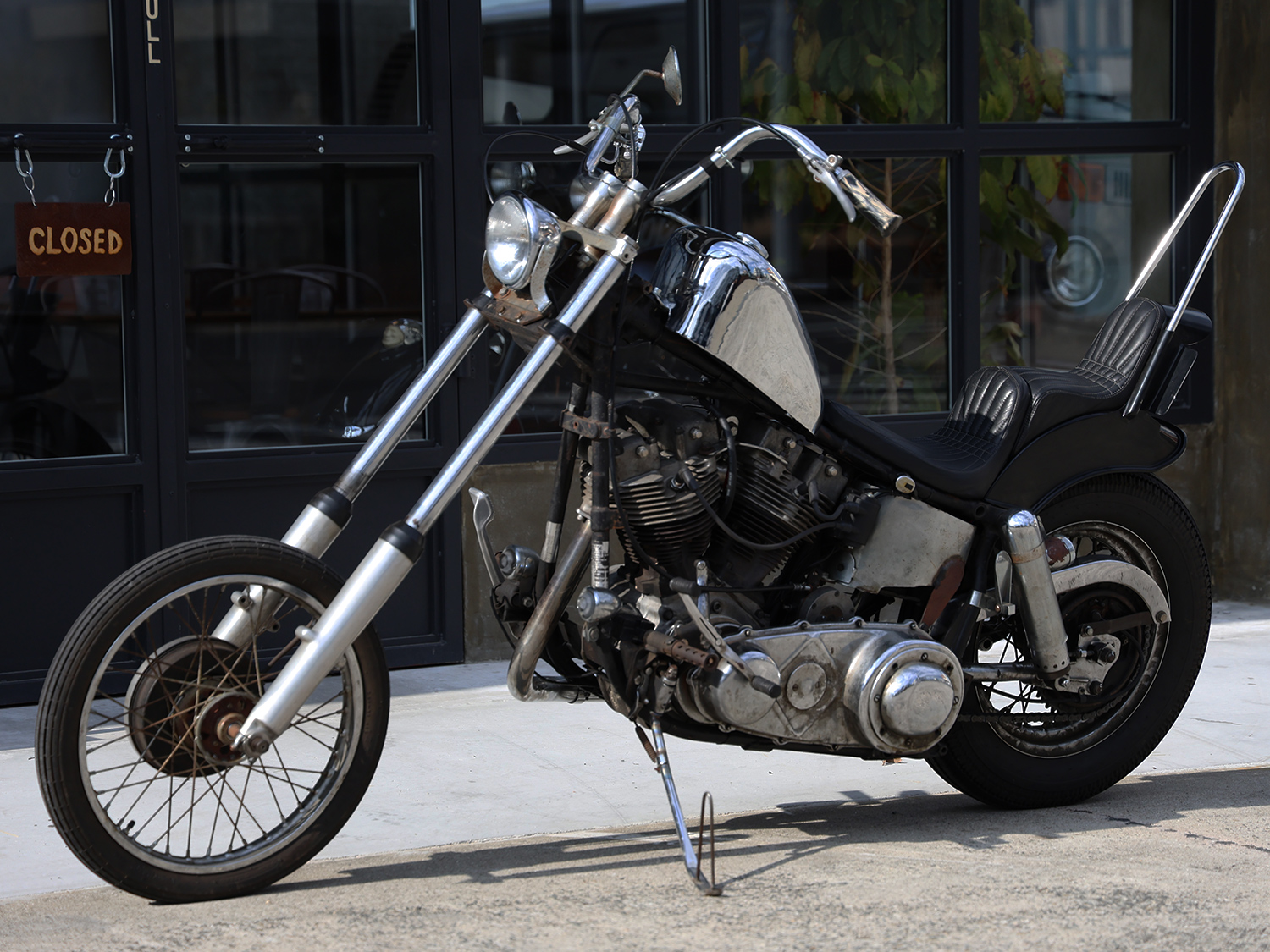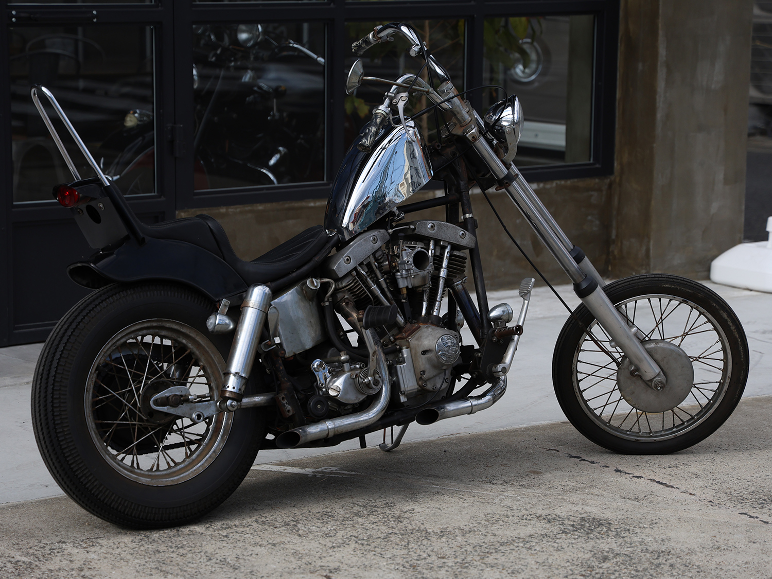 フロントフォークは41ワイドグライド10-12インチオーバーにアーリー用の左ドラムブレーキ、ホイールは当時物極細18インチ、ナローリムでフロント回りだけでも価値があり、これだけのセットアップにはかなりの費用が掛かります。それに付け加えて、当時物ベイツKDライト(希少なサイドマウント仕様)にステーまでBATESの希少な当時物が装着されています。タンクはクロームのスポタンをハイマウント、リア周りはクレイジーフランク(当時物かは不明)でスイングアームチョッパーの最上の組み合わせです。フロントのドラムに合わせて、リアもジュースドラムで前後ドラム仕様、スイングアームはアーリーショベルから72年までの通称丸スイングアーム(しかもオールドクローム)が装着されています。プライマリーカバーもパンヘッドタイプのオールドクローム仕様、どの角度から見ても妥協の無く、雰囲気激ヤバなチョッパーです。肝心のエンジン・ミッションについても既にフルオーバーホール済みですので、すぐに安心して乗って頂けます。